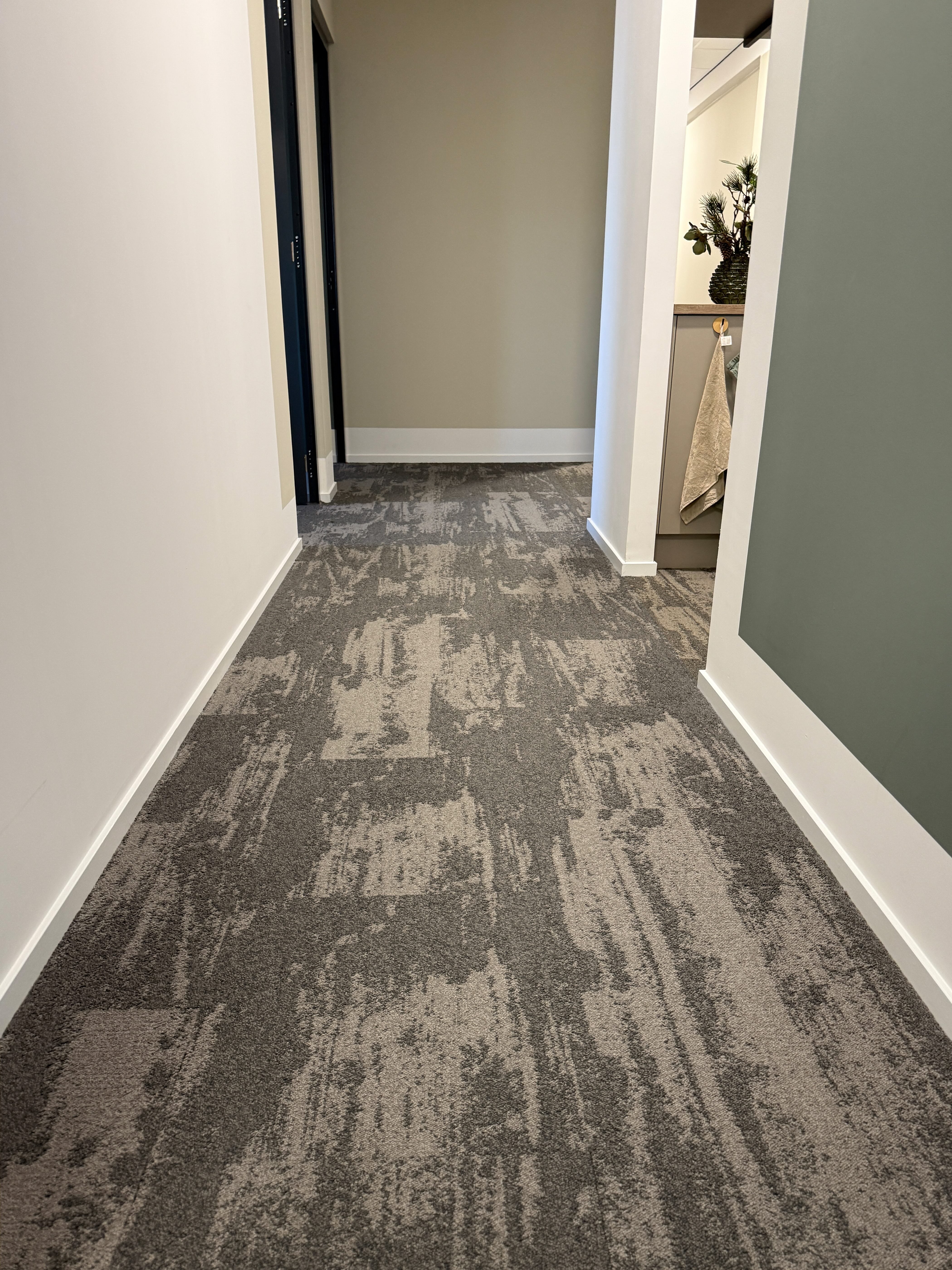 Hier haben wir Teppichfliesen in Beton- und Marmor-Look kombiniert, um zu zeigen, wie jedes Design einen Raum bereichern kann. Der Beton-Look verleiht eine moderne, urbane Note, während der Marmor-Look für eine elegante und luxuriöse Atmosphäre sorgt.